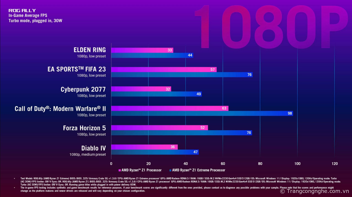 AMD Ryzen Z1 là một chip mạnh mẽ có khả năng xử lý mượt mà ngay cả những thư viện trò chơi lớn nhất, từ các tựa game AAA đến các trò chơi indie và retro. ASUS đã tiến hành các thử nghiệm và kết quả cho thấy ngay cả trong những trò chơi tài nguyên nặng như Cyberpunk 2077 và Diablo IV, Ryzen Z1 có thể đạt tốc độ trên 30 FPS ở độ phân giải 1080p khi được thiết lập ở chế độ Turbo. Ngoài ra, nhiều trò chơi khác còn vượt quá 45 hoặc 60 FPS, mang đến trải nghiệm chơi game cầm tay mượt mà. Dưới đây là danh sách các trò chơi mà chúng tôi đã thử nghiệm trên hai phiên bản ROG Ally: