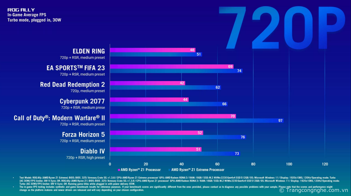 Và khi sử dụng ở độ phân giải 720p và kích hoạt chức năng tăng tỷ lệ lên 1080p bằng RSR (Radeon Super Resolution), hiệu năng của ROG Ally Ryzen Z1 được nâng cao đáng kể hơn:
