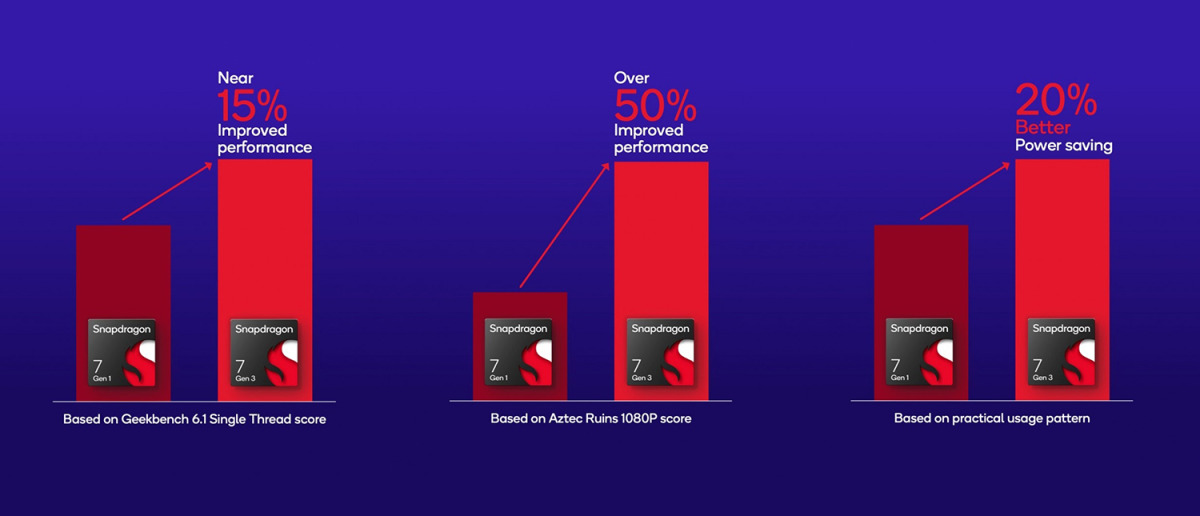 Qualcomm tuyên bố con chip mới cải thiện 15% hiệu suất CPU và GPU Adreno nhanh hơn 50% so với chip Snapdragon 7 Gen 1 năm ngoái. Chip thế hệ thứ 7 cũng được cho là có khả năng tiết kiệm 20% năng lượng dựa trên các thử nghiệm của Qualcomm.
