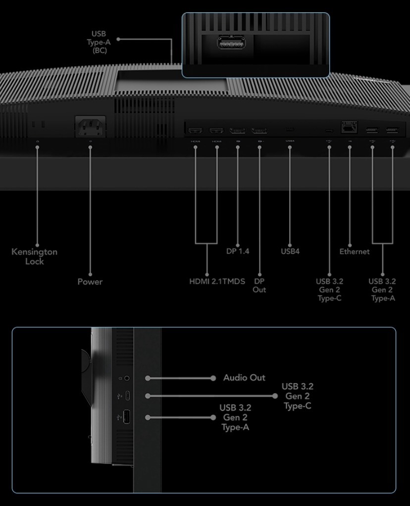 Các cổng kết nối trên Lenovo ThinkVision P27pz/P32pz bao gồm hai cổng HDMI 2.1, một cổng USB 4.0 Type-C, hai cổng DP 1.4, một cổng USB 3.2 Gen 2 Type-C, bốn cổng USB Type-A giúp kết nối đa dạng các thiết bị ngoại vi. Cổng USB 4.0 hỗ trợ cấp nguồn lên tới 140W (PD 3.1) và tốc độ truyền dữ liệu 40Gbps.