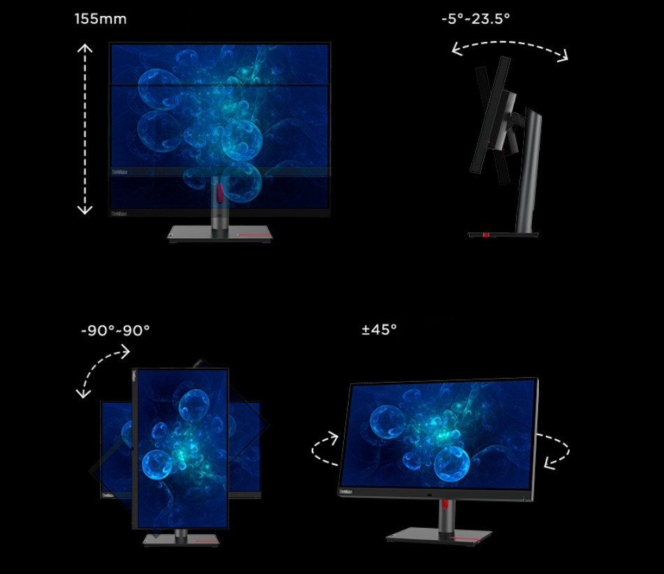 Màn hình trang bị chân đế linh hoạt có thể thay đổi độ cao 155mm, góc nghiêng màn hình từ -5 - 23,5 độ, màn hình quay quanh trục 45 độ và quay dọc màn hình 90 độ.