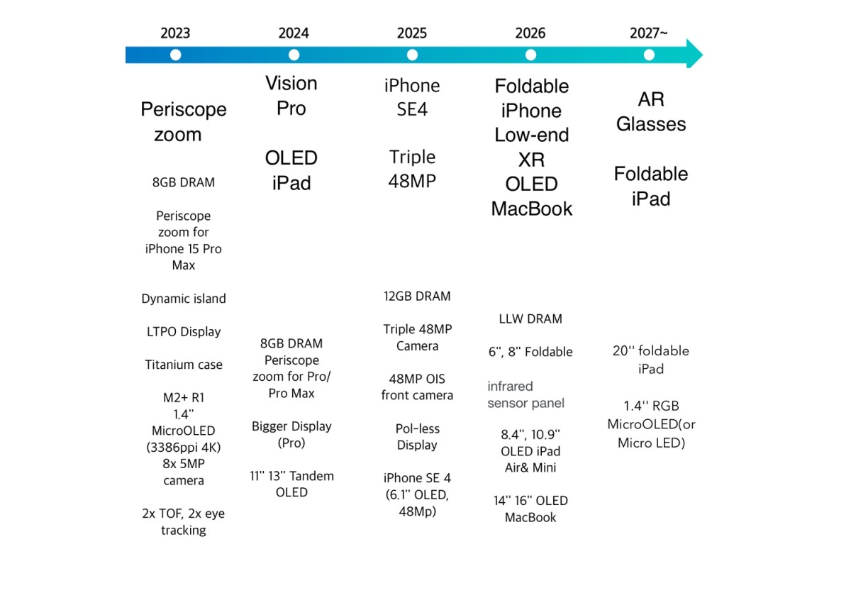 Lộ trình cho biết, dòng iPad Air OLED cũng sẽ ra mắt vào năm 2026, với 2 phiên bản 8,4 inch và 10,9 inch. Cùng dải sản phẩm sử dụng tấm nền OLED thì MacBook OLED 14 inch và 16 inch được lên kế hoạch cho năm 2026.
