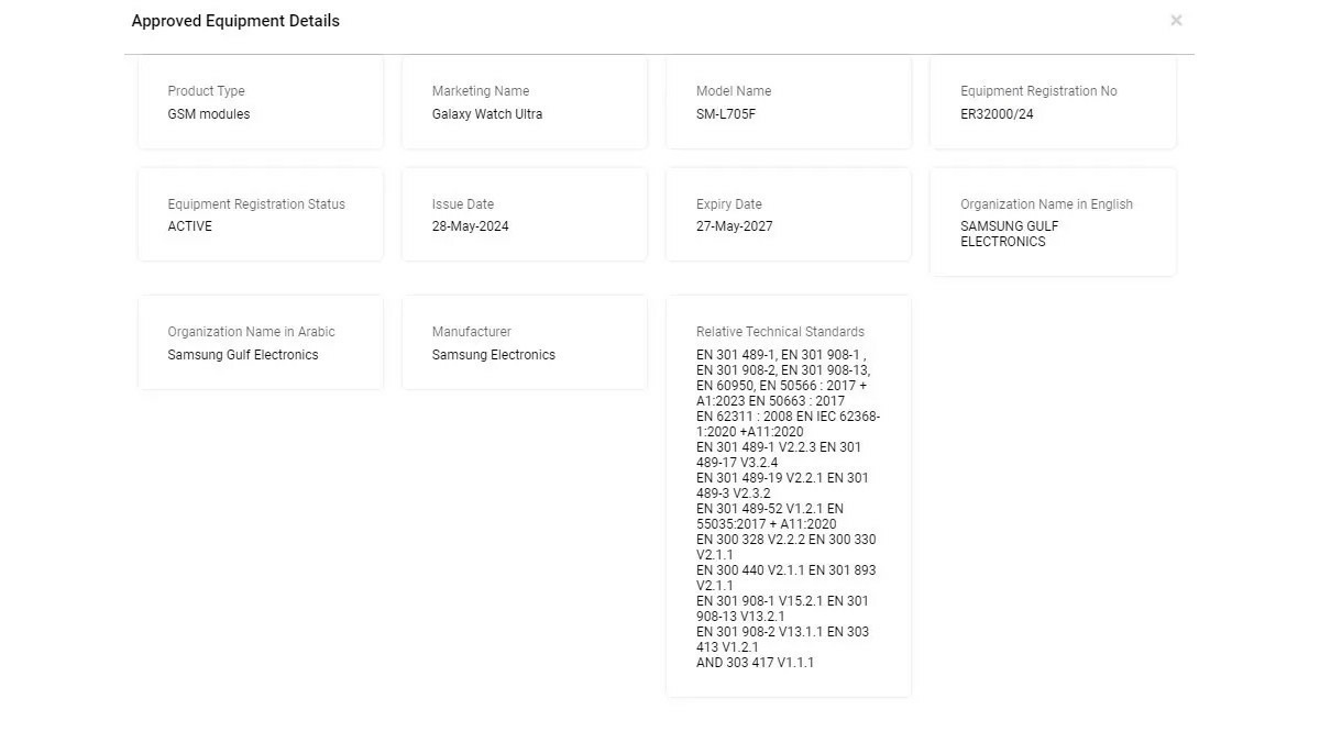 Theo đó, chứng nhận TDRA của UAE cho thấy, thiết bị có tên gọi Galaxy Watch Ultra với số model SM-L705F và có kết nối di động trong biến thể này. Danh sách FCC của cũng cho biết rằng Watch Ultra sẽ hỗ trợ sạc 10W.