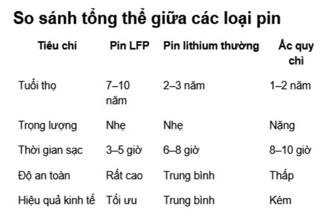 Đặc biệt, pin LFP không bị “hiệu ứng nhớ” như ắc quy – người dùng có thể sạc bất kỳ lúc nào mà không ảnh hưởng đến tuổi thọ pin.