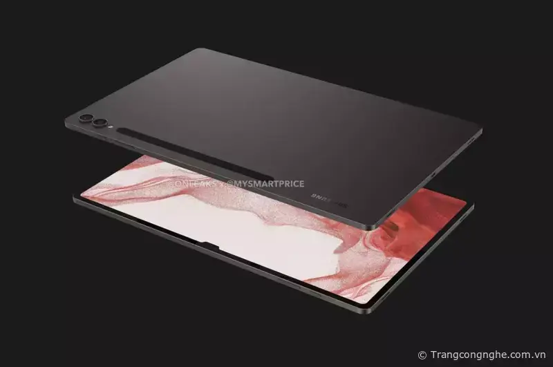 - Samsung Galaxy Tab S9 Ultra sẽ có thân máy bằng kim loại nguyên khối, mặt sau có logo Samsung và trang bị camera kép đặt dọc theo thân máy