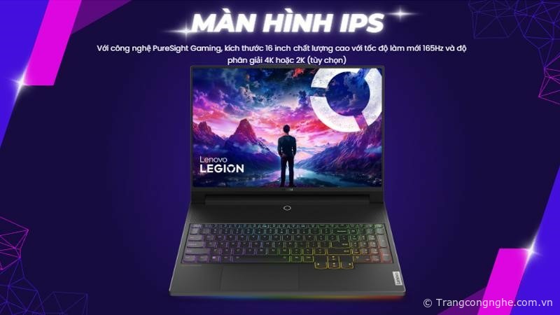 Lenovo Legion 9i trang bị màn hình IPS với công nghệ PureSight Gaming, kích thước 16 inch, chất lượng cao với tốc độ làm mới 165Hz và độ phân giải tùy chọn 4K hoặc 2K, đảm bảo cho người dùng trải nghiệm hình ảnh sắc nét và mượt mà khi chơi game hoặc làm việc với đồ họa. Lớp vỏ ngoài của thiết bị được làm bằng chất liệu carbon hoàn toàn mới. Với chất liệu này, Lenovo đã đạt được sự kết hợp hoàn hảo giữa độ bền và máy trở nên siêu nhẹ nhưng vẫn mang lại độ cứng cáp, chống va đập, bảo vệ các linh kiện quan trọng bên trong.