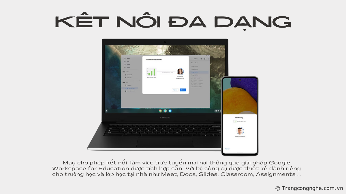 Galaxy Chromebook cho phép kết nối, làm việc trực tuyến mọi nơi thông qua giải pháp Google Workspace for Education được tích hợp sẵn. Với bộ công cụ được thiết kế dành riêng cho trường học và lớp học tại nhà như Meet, Docs, Slides, Classroom, Assignments …, Galaxy Chromebook cung cấp hệ sinh thái ứng dụng toàn diện cho giáo dục trực tuyến. Người dùng có thể dùng tính năng Nearby Share khi cần chuyển dữ liệu giữa các thiết bị cùng chung hệ điều hành Chrome OS.