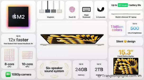 Ngoài ra, vi xử lý M2 cũng mang lại hiệu năng tiết kiệm năng lượng tốt hơn, với MacBook Air 15-inch mới có thời lượng pin lên đến 18 giờ.