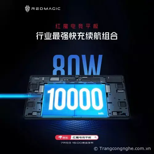 Nhà sản xuất này gần đây đã tiết lộ rằng Red Magic 8S Pro sẽ có pin 6.000 mAh với hỗ trợ sạc 165W và giờ đây, thương hiệu nãy tiếp tục thông tin rằng Máy tính bảng chơi game Red Magic Gaming Tablet sẽ đi có dung lượng pin 10.000 mAh với công suất sạc lên đến 80W.
