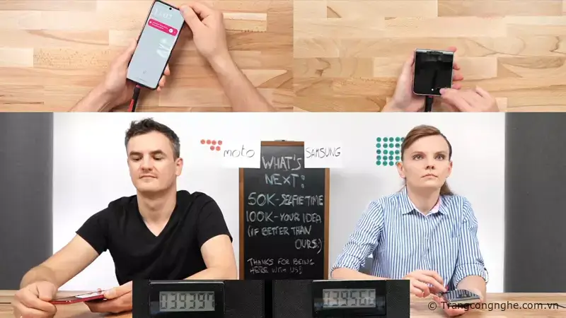 Các Youtuber đã tiến hành gấp điện thoại liên tục lên đến 14 giờ đồng hồ. Mục đích của cuộc “thử nghiệm gập lớn” giữa hai điện thoại gập mới này là để xem chúng tồn tại được bao lâu khi người dùng sử dụng gập chúng bằng tay so với máy móc gập chúng hàng trăm nghìn lần trong các thử nghiệm tại phòng thí nghiệm.