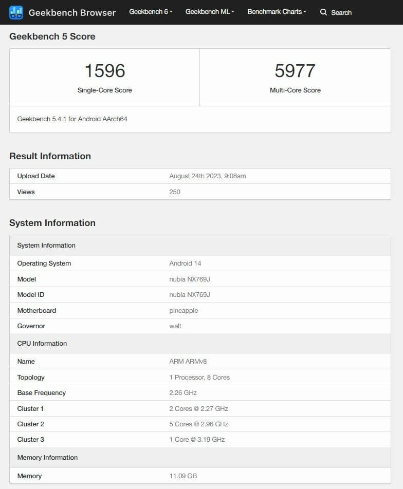 Một nguyên mẫu điện thoại được phát hiện trên Geekbench có tên mã NX769J được dự đoán là mẫu ZTE nubia Red Magic 9. Nguyên mẫu này được trang bị RAM 12GB và chạy sẵn Android 14 đạt điểm số đơn nhân 1.596 và đa nhân lên đến 5.977 điểm, cao hơn 20% so với kết quả chipset Qualcomm thế hệ thứ hai đã ra mắt trước đó.