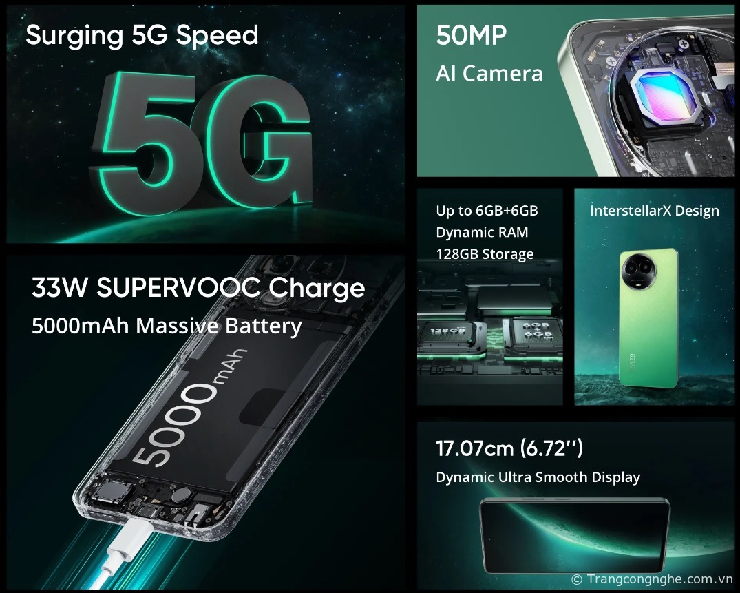 Các tùy chọn kết nối khác của Narzo 60x 5G bao gồm SIM kép, mạng 5G, WiFi băng tần kép, Bluetooth 5.2, GNSS và USB Type-C. Nó cũng đi kèm với cảm biến vân tay gắn cạnh bên và giắc cắm tai nghe 3,5 mm.