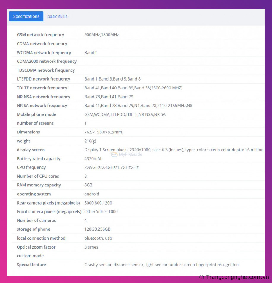 Thiết bị xuất hiện trên trang chứng nhận TENAA sử dụng chip Snapdragon với kiến trúc CPU 8 lõi và tốc độ tối đa 2,99 GHz, cùng 8GB RAM và các tùy chọn bộ nhớ lưu trữ 128GB hoặc 256GB.