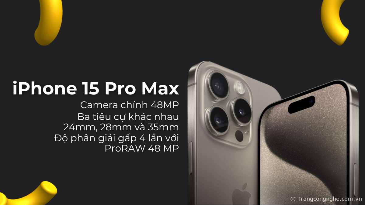 Camera chính trên mẫu iPhone mới này còn có tính năng đặc biệt cho phép người dùng linh hoạt chuyển đổi giữa ba tiêu cự khác nhau là 24mm, 28mm và 35mm. Bạn cũng có thể chọn một trong ba tiêu cự này làm mặc định cho máy ảnh, tùy theo nhu cầu của bạn trong từng tình huống chụp khác nhau. Ngoài ra, iPhone 15 Pro Max hỗ trợ ảnh HEIF 48 MP, độ phân giải cao gấp 4 lần so với ProRAW 48 MP. Mang lại sự linh hoạt trong việc lưu trữ và chia sẻ hình ảnh chất lượng cao.