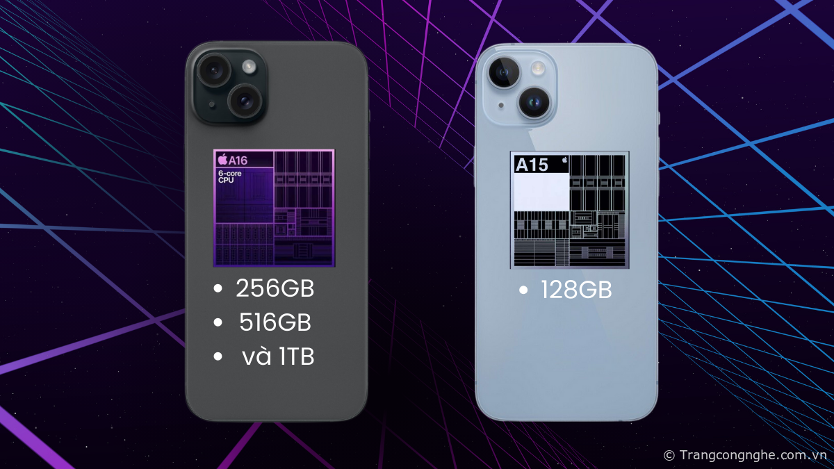 Trong khi iPhone 14 Plus sử dụng CPU A15 Bionic, cũng mạnh mẽ và hiệu quả, nhưng có cấu hình CPU thấp hơn so với A16 Bionic trên iPhone 15 Plus. Dòng kế nhiệm vẫn được trang bị Neural Engine để hỗ trợ tính toán trí tuệ nhân tạo, nhưng số lõi có thể ít hơn so với iPhone 15 Plus.