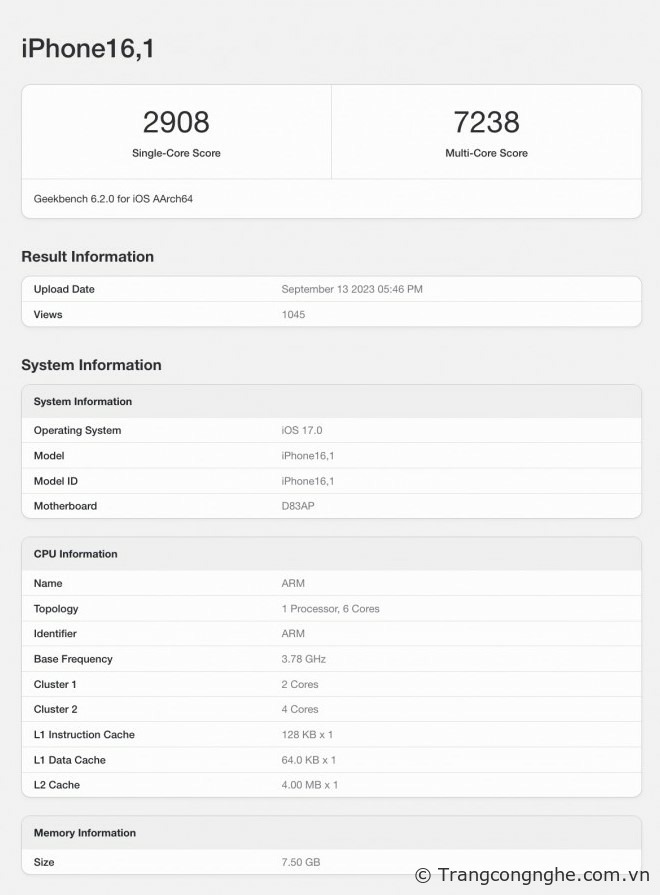 Đối với iPhone 15 Pro Max (iPhone 16,2) lần lượt đạt 2.846 điểm đơn nhân và 7.024 điểm đa nhân. Dữ liệu Geekbench cũng xác nhận RAM 8GB như đã tiết lộ trước đây trên Xcode. Vi xử lý A16 Bionic trang bị trên iPhone 14 Pro Max đã đạt được 2546 và 6631 điểm trong các kiểm tra đơn nhân và đa nhân.