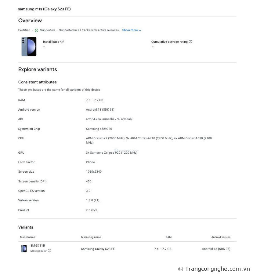 Hai biến thể của Galaxy S23 FE đã được phát hiện trên Google Play Console có tên mã Samsung r11q và Samsung r11s. Theo những gì tiết lộ, sản phẩm có tên mã r11q được trang bị chipset Snapdragon 8 Gen 1 với GPU Adreno 730 từ Qualcomm và mã r11s đã được liệt kê trong danh sách sử dụng chipset Exynos 2200 của Samsung tự tay sản xuất. Ngoài CPU và GPU, các thông số còn lại trên Google Play Console cho biết hai biến thể sẽ có trang bị như nhau.