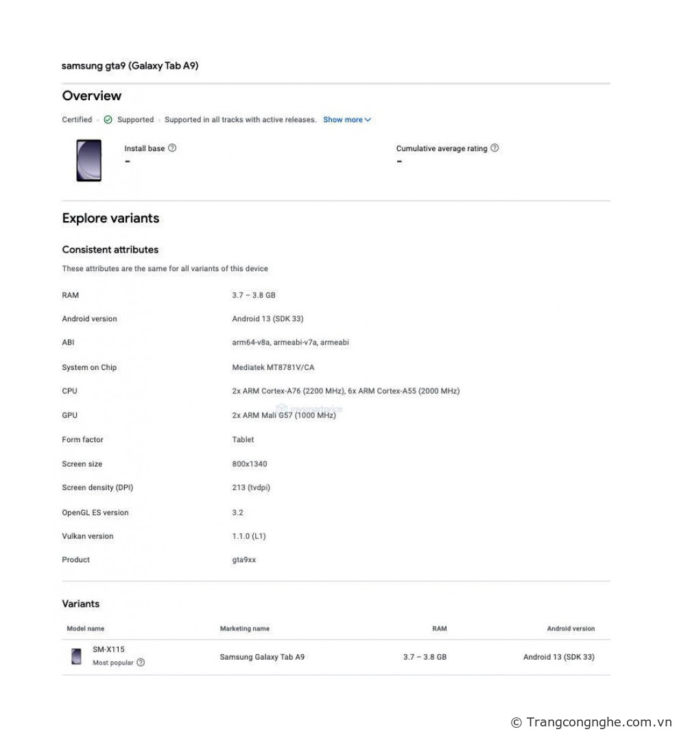 Thông tin Galaxy Tab A9 trên Google Play Console