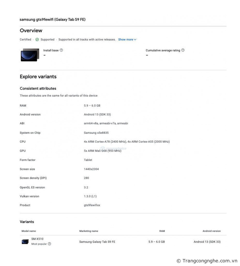 Thông tin Galaxy Tab S9 FE trên Google Play Console