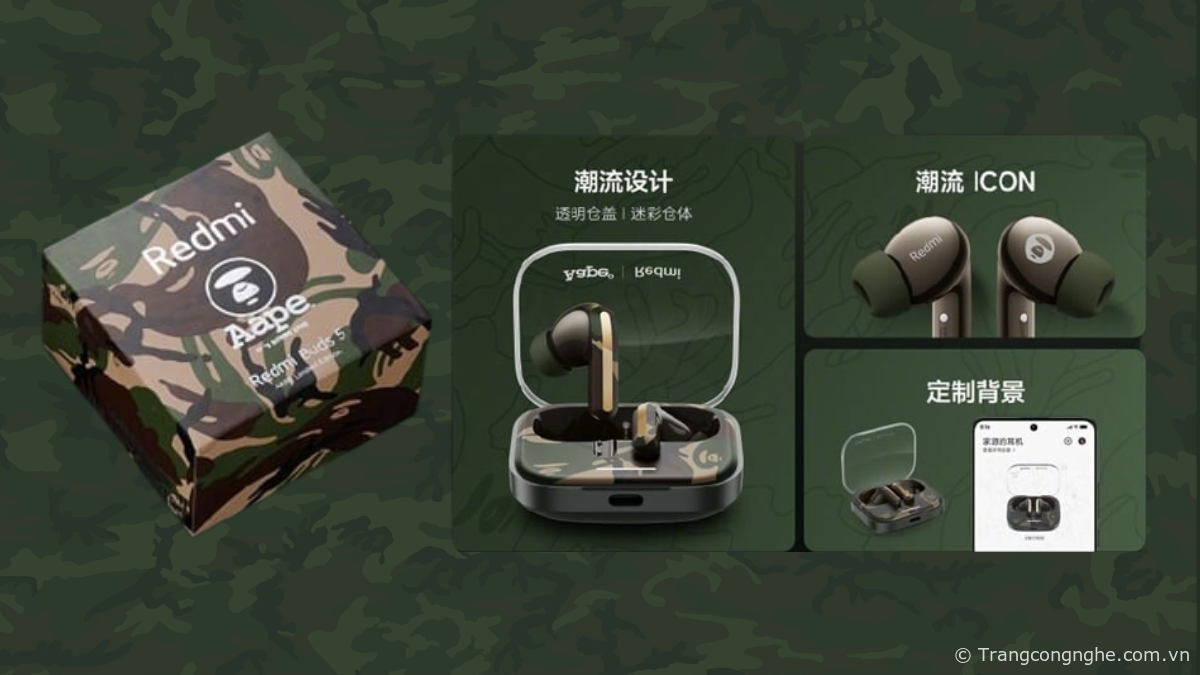 Cùng nằm trong bộ sưu tập hợp tác với thương hiệu thời trang nổi tiếng là mẫu tai nghe không dây Redmi Buds 5 AAPE Trend Limited Edition cũng với hoạt tiết rằn ri tương tự Note 13 Pro+.