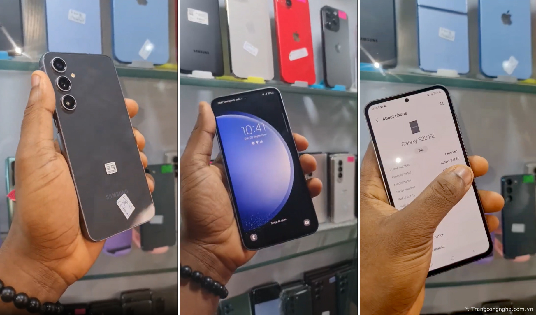 Đoạn video trên tay dường như được quay tại một cửa hàng bán lẻ với mọi góc cạnh của chiếc Galaxy S23 FE. Sản phẩm này có màu xám đậm với thiết kế gần giống Galaxy S23, với màn hình viền khá dày cùng mặt lưng phẳng, cụm 3 camera sau đặt dọc ở thân máy.