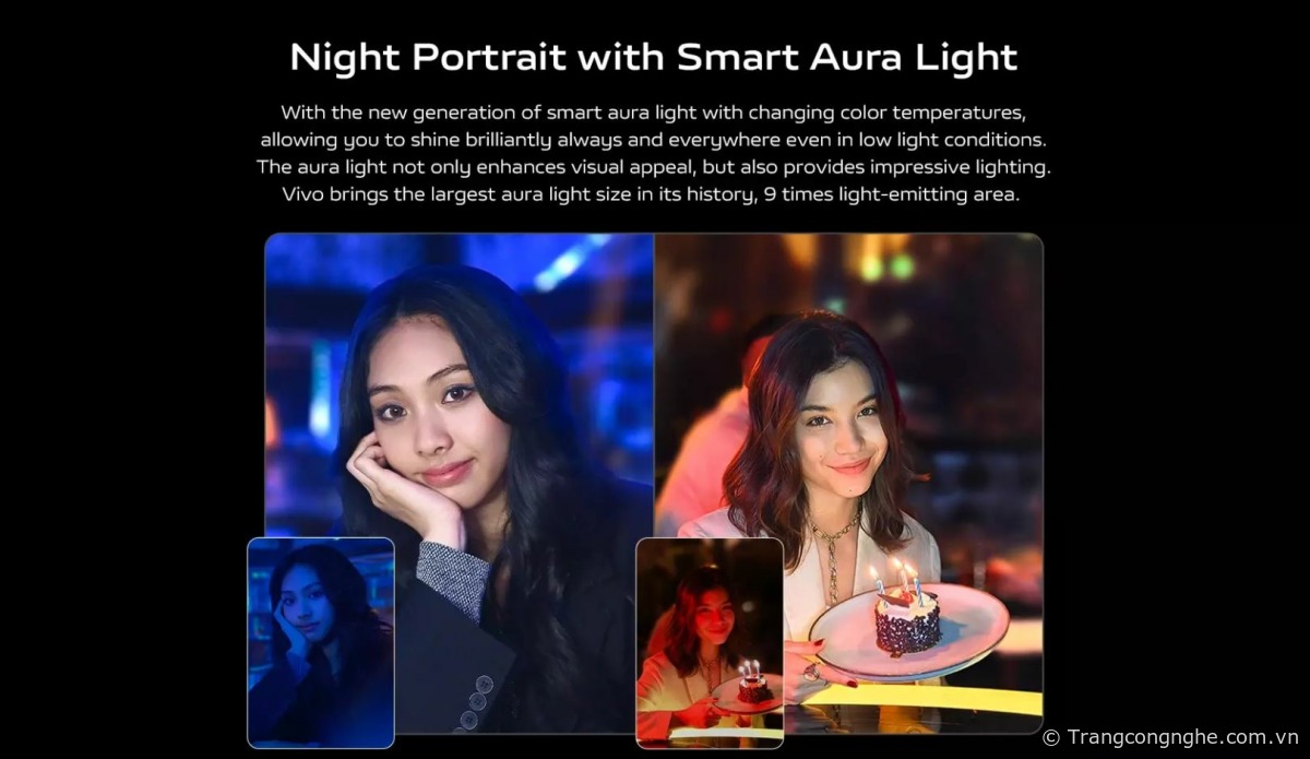 Có vẻ như vivo muốn đưa cụm đèn Smart Aura Light trở thành một tiêu chuẩn mới khi những sản phẩm ra mắt gần đây đều sở hữu tính năng này, vivo cho biết Smart Aura Light trên V29 Pro sáng hơn 36% so với thế hệ trước. Đèn flash này có thể tự động điều chỉnh nhiệt độ màu theo ánh sáng xung quanh.