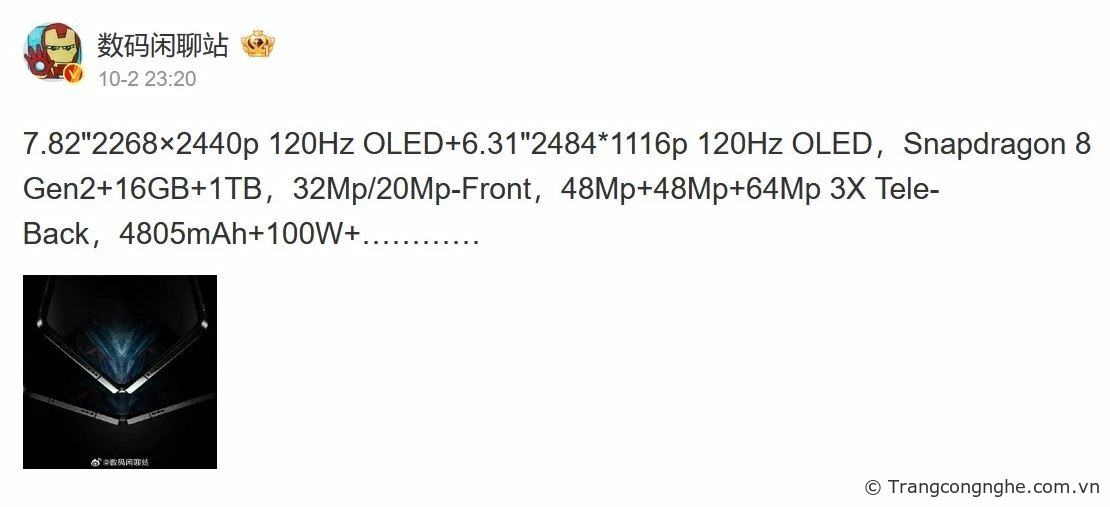 Trong một bài đăng trên Weibo của tài khoản Digital Chat Station, người này không chỉ đăng tải ảnh báo chí của mẫu điện thoại mà còn một lần nữa công bố các thông số kỹ thuật được cho là của thiết bị gập này.