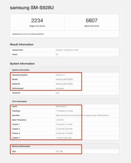 Dữ liệu GeekBench cho thấy phiên bản Galaxy S24 Ultra cho thị trường Mỹ, có tên mã SM-S928U, sử dụng con chip Snapdragon 8 Gen 3. Điện thoại thông minh này đạt 2.234 điểm trong bài kiểm tra đơn nhân và 6.807 điểm trong bài kiểm tra đa nhân.