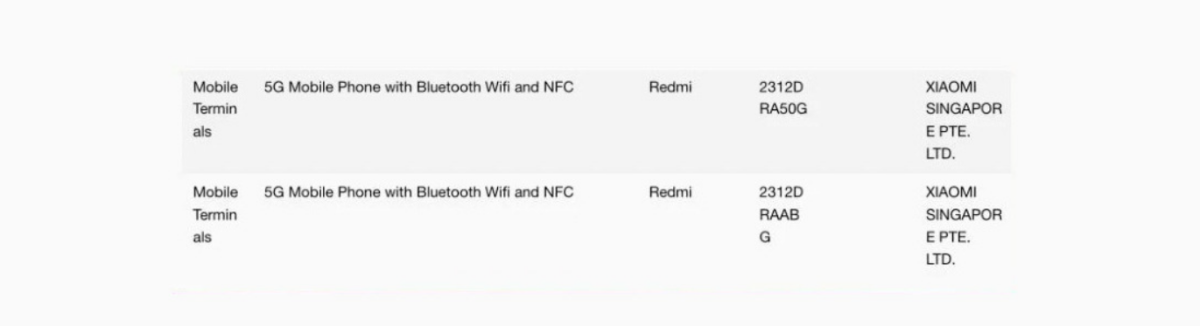 Hôm nay, leaker Mukul Sharma đã phát hiện hai mẫu điện thoại thuộc dòng Redmi Note 13 đạt chứng nhận IMDA của Singapore. Một biến thể có số model 2312DRAABG và đây có vẻ là Redmi Note 13 tiêu chuẩn. Đối với model 2312RA50G có thể là Redmi Note 13 Pro hoặc Redmi Note 13 Pro Plus.