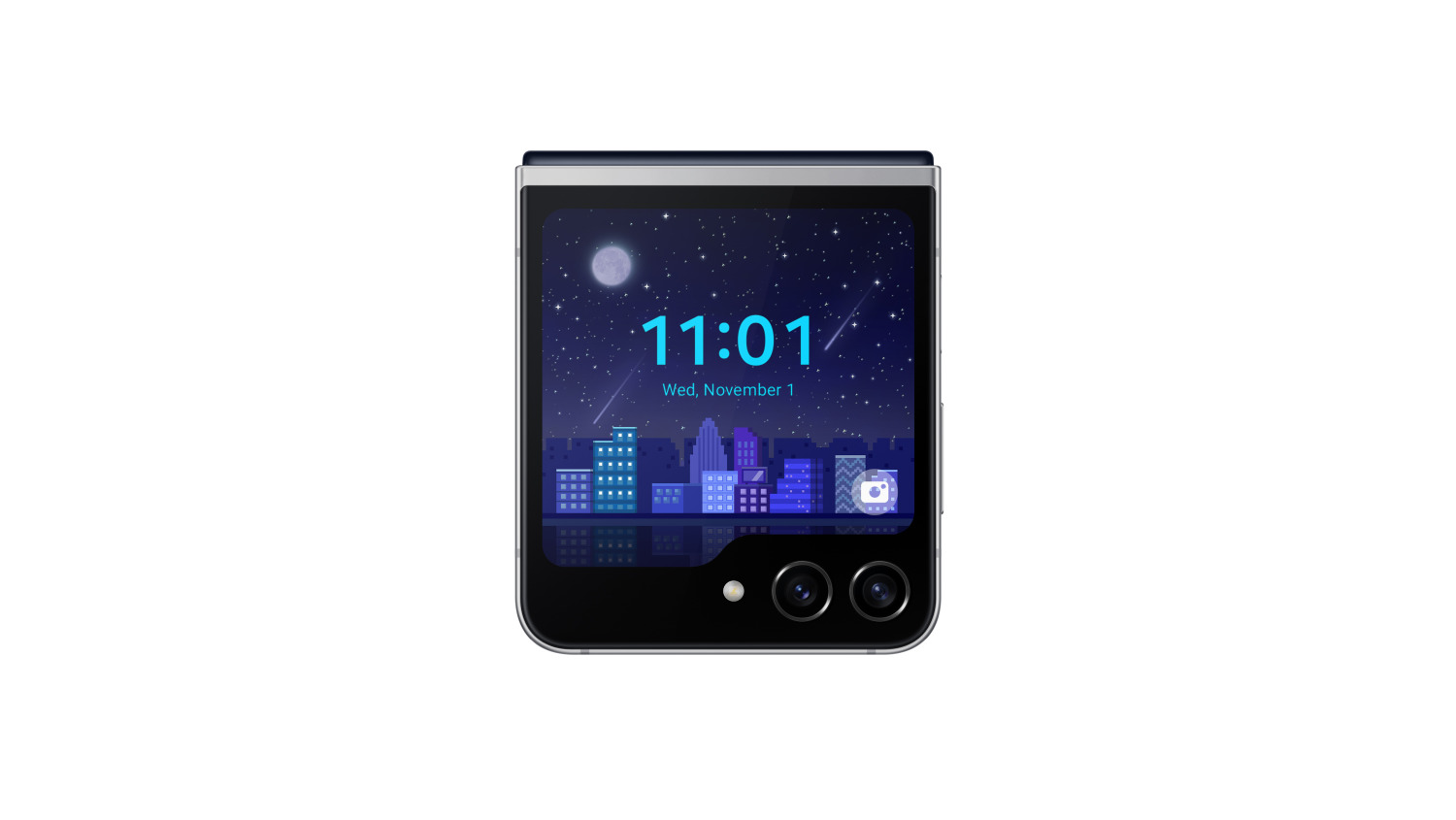 Galaxy Z Flip5 Retro có các màu xanh chàm và bạc mang tính biểu tượng tương tự trên E700, đi kèm với một số chỉnh sửa giao diện người dùng với đồ họa pixel hoài cổ và hoạt hình cảnh quan thành phố trên màn hình phụ Flex Window.