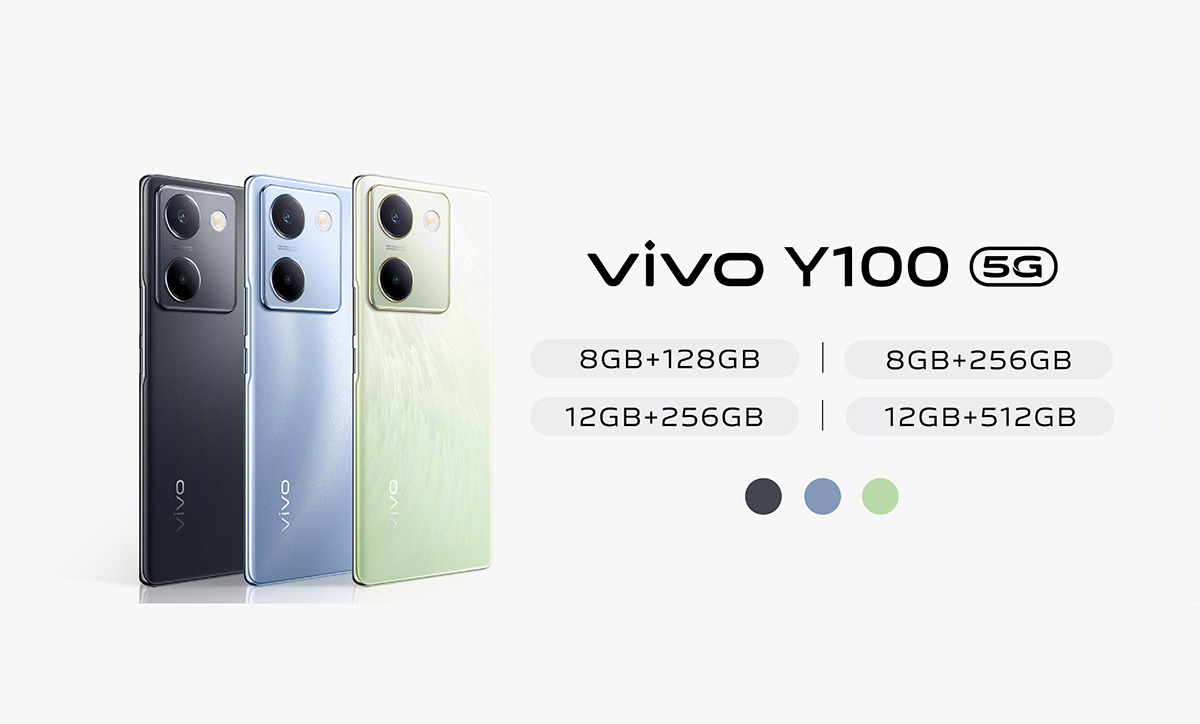 Vivo Y100 5G có nhiều tùy chọn màu sắc, cụ thể là Đen (Starry Black), Xanh (Glass Blue) và mẫu Xanh lục có họa tiết đặc biệt. Máy có giá bán khởi điểm từ 1.399 NDT (khoảng 4,7 triệu đồng) cho phiên bản RAM 8GB + 128GB. Với biến thể RAM 8GB + 256GB và RAM 12GB + 256GB có giá lần lượt là 1.599 NDT (khoảng 5,4 triệu đồng) và 1.799 NDT (khoảng 6 triệu đồng). Với phiên bản cao cấp nhất RAM 12GB + 512GB có mức giá 1.999 NDT (khoảng 6,7 triệu đồng).
