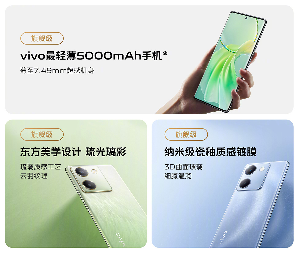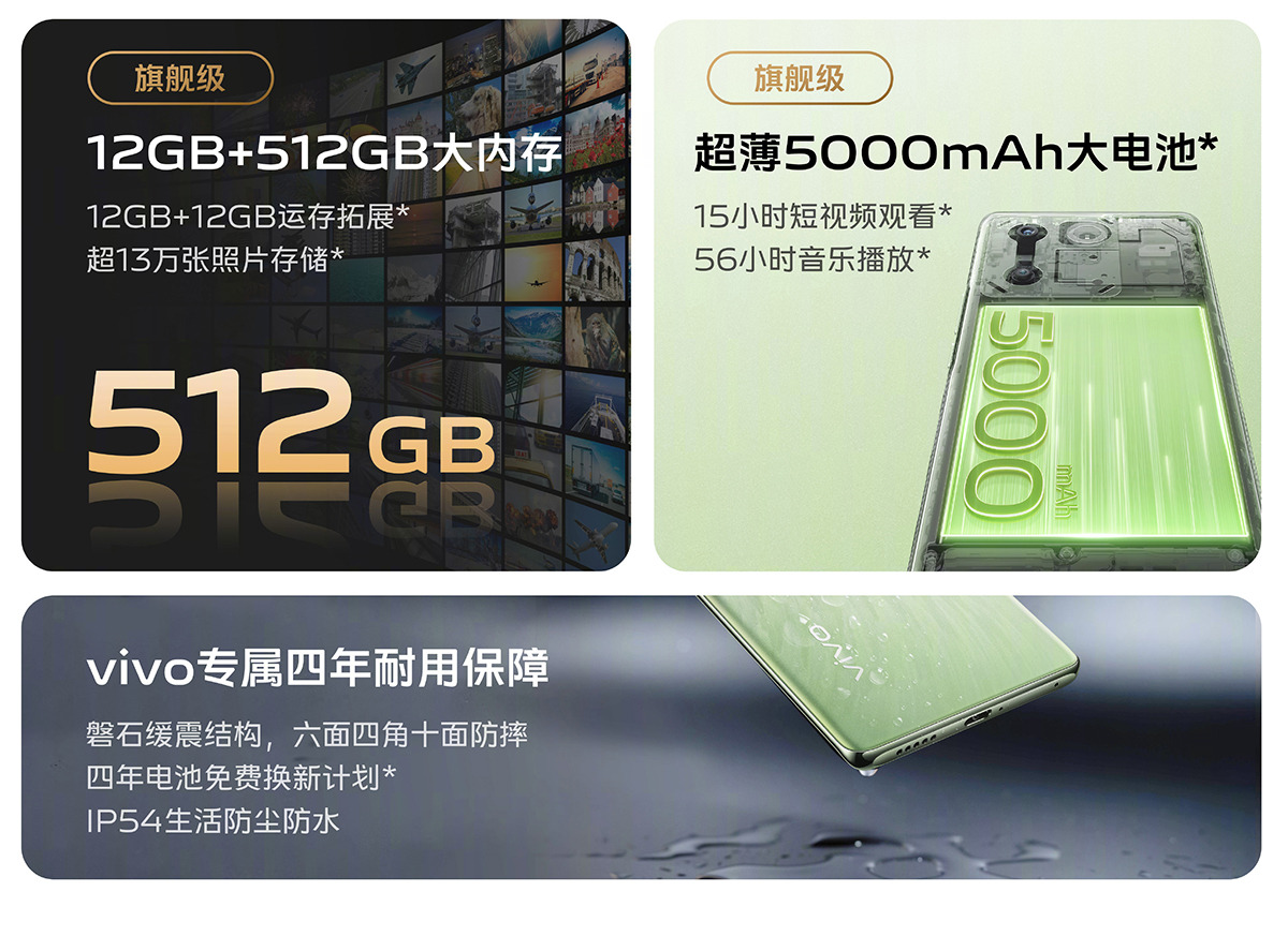 Viên pin lớn 5.000 mAh cung cấp năng lượng cho máy và hỗ trợ sạc nhanh 44W. Các tính năng đáng chú ý khác bao gồm khả năng chống nước và bụi IP54, cảm biến vân tay trong màn hình, giao diện người dùng OriginOS 3 dựa trên hệ điều hành Android 13 và tính năng nhận dạng khuôn mặt.