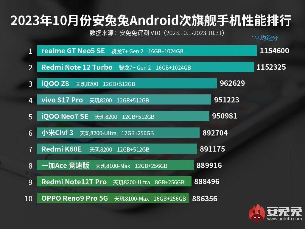 AnTuTu mới đây đã công bố danh sách Top 10 smartphone tầm trung tốt nhất tháng 10 năm 2023, theo đó vị trí đầu bảng gọi tên realme GT Neo 5 SE.