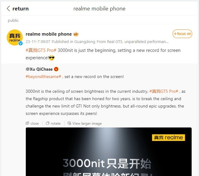 Trong một bài đăng trên Weibo của tài khoản chính thức realme, nhà sản xuất này cho biết GT 5 Pro sẽ có độ sáng tối đa 3000nit. OnePlus cho biết thêm: “Không chỉ độ sáng mà nó còn đi kèm với những nâng cấp toàn diện, trải nghiệm màn hình vượt trội so với các sản phẩm cùng loại”.
