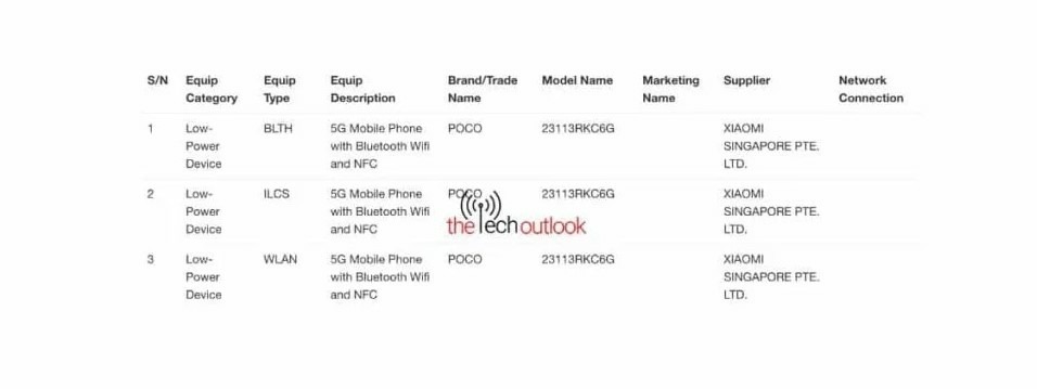 Theo TheTechoutlook, POCO F6 Pro được cho là có chứng nhận IMDA với số model 23113RKC6G. Số kiểu máy này khớp với thông tin rò rỉ trước đó cho biết đây là phiên bản toàn cầu của POCO F6 Pro. Mặc dù danh sách không tiết lộ bất kỳ chi tiết thông số kỹ thuật nào nhưng nó xác nhận rằng điện thoại sẽ được ra mắt tại Singapore.