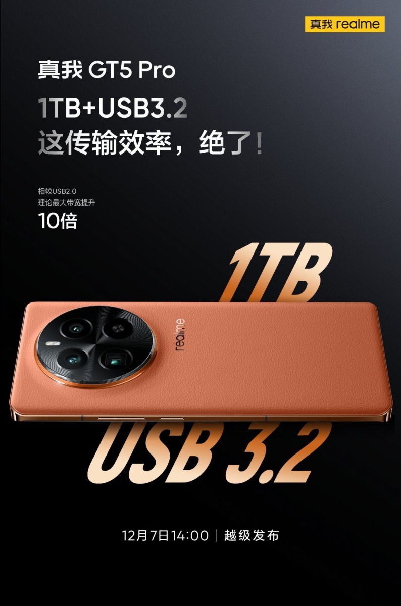 Bên cạnh đó, Realme đã xác nhận biến thể cao cấp nhất của Realme GT5 Pro sẽ được trang bị dung lượng lưu trữ 1 TB vô cùng thoải mái cho các nhu cầu lưu trữ video, hình ảnh hay cài đặt ứng dụng, trò chơi. Các poster cũng cho biết GT5 Pro sẽ sử dụng USB-C hỗ trợ chuẩn USB 3.2, có thể cung cấp tốc độ truyền dữ liệu nhanh hơn lên tới 10 GB/s so với USB 2.0, chỉ hỗ trợ tối đa 480 Mbps.