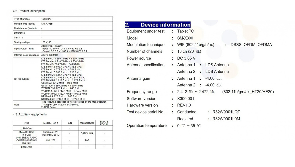 Theo danh sách chứng nhận FCC, Galaxy Tab Active5 sẽ có hai biến thế kết nối bao gồm 5G mang số model SM-X306B và chỉ có WiFi với model SM-X300i. Theo mặc định, máy tính bảng sẽ có bộ nhớ trong 128GB với khe cắm thẻ nhớ mở rộng microSD. Galaxy Tab Active5 cũng được hỗ trợ S-Pen tuy nhiên chỉ có bộ sạc 15W khá khiêm tốn.