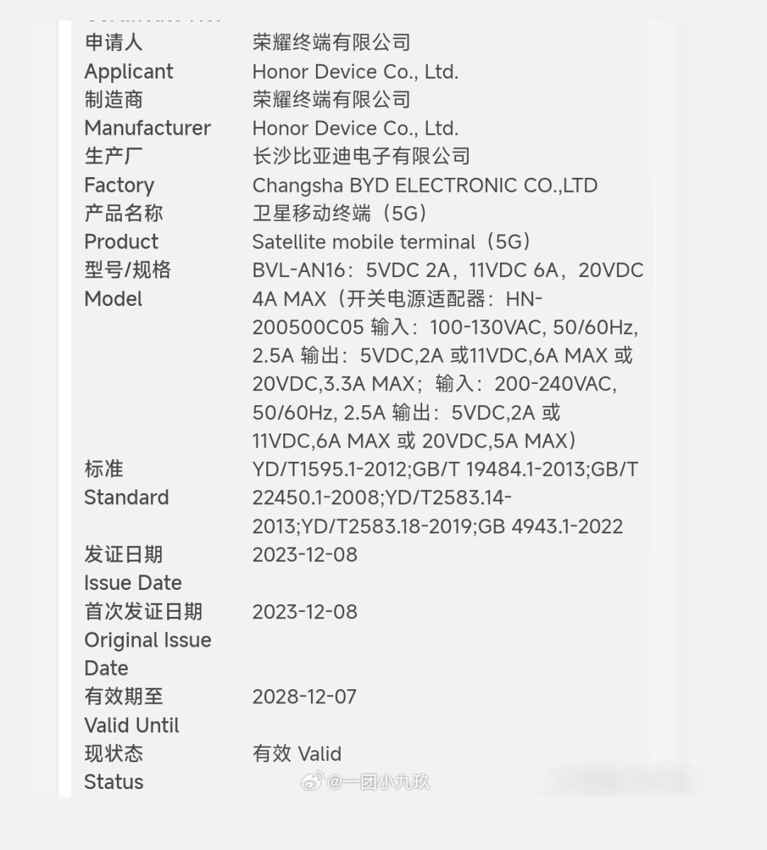 Danh sách 3C liệt kê thiết bị có số số model BVL-AN16 được xác nhận là honor Magic 6 Pro sẽ hỗ trợ mạng 5G. Tuy nhiên, chi tiết đang chú ý nhất là nhãn của nó “Thiết bị đầu cuối di động vệ tinh 5G”.