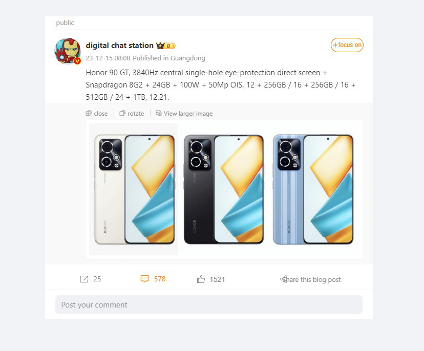 Hôm nay, leaker nổi tiếng Digital Chat Station đăng trên Weibo cho biết honor 90 GT cung cấp tấm nền OLED độ phân giải 1.5K và khả năng làm mờ 3.840Hz. Không có thông tin về camera trước của thiết bị, nhưng thiết lập camera phía sau được cho là có camera chính 50 MP hỗ trợ OIS.