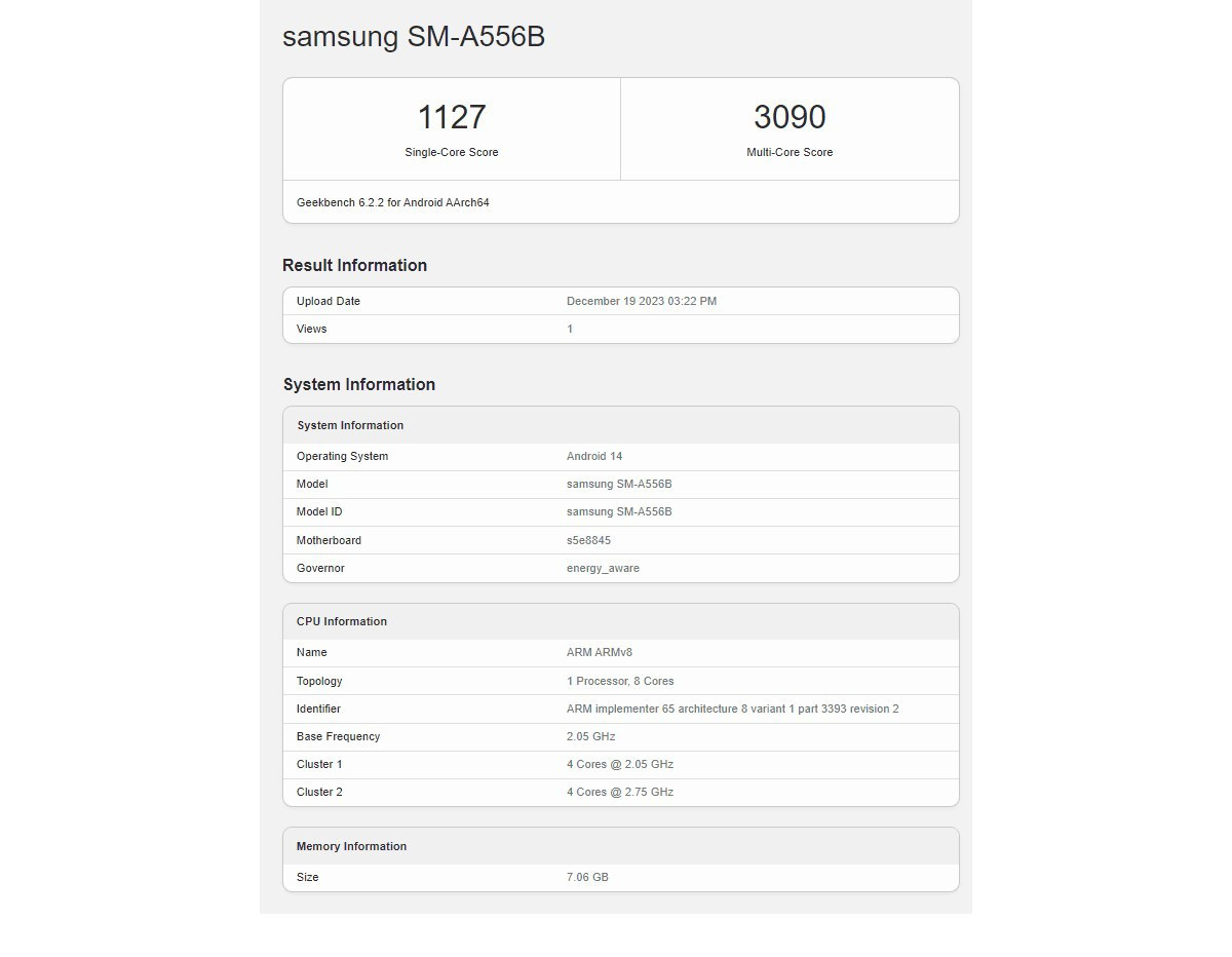 Exynos 1480 đạt 1.127 điểm kiểm tra đơn nhân và 3.090 điểm kiểm tra đa nhân, cao hơn một chút so với số 1.108 và 2.797 tương ứng trên Galaxy A54. Cấu hình phiên bản chạy thử nghiệm Geekbench có RAM 8GB, đây là dung lượng RAM cao nhất trên Galaxy A54, do đó có thể hy vọng Samsung cung cấp thêm các tùy chọn cao hơn cho thiết bị mới.