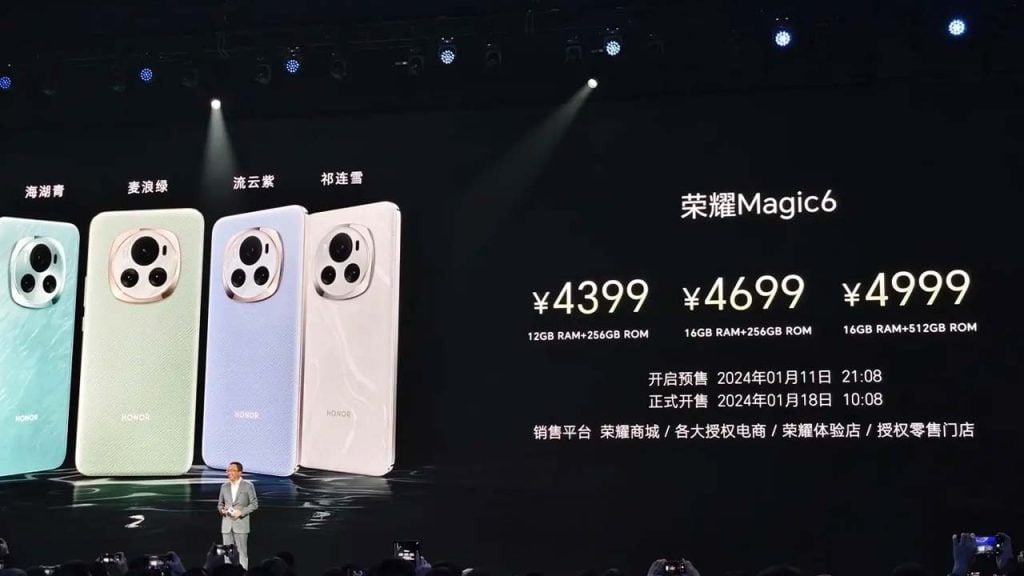 Honor Magic 6 hiện có sẵn tại Trung Quốc và dự kiến sẽ sớm có mặt trên toàn cầu. Mức giá bán cho phiên bản 12+256GB là 4,399 NDT (khoảng 15,1 triệu đồng), phiên bản 16+256GB và 16+512GB có giá lần lượt là 4.699 NDT (khoảng 16,2 triệu) và 4.999 NDT (khoảng 17,2 triệu).