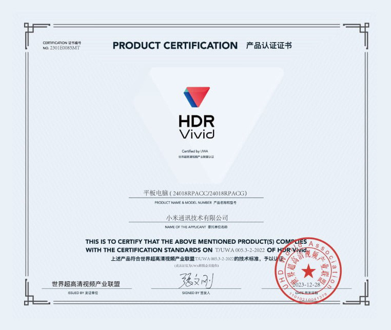 Bên cạnh đó, một thiết bị được xác định là phiên bản toàn cầu có số model 24018RPACG cũng đạt chứng nhận HDR Vivid. Đây là một tiêu chuẩn xác nhận có thiết bị đạt HDR Vivid có khả năng tối ưu hóa độ sáng, độ tương phản và màu sắc của từng khung hình thông qua các siêu dữ liệu khác nhau.