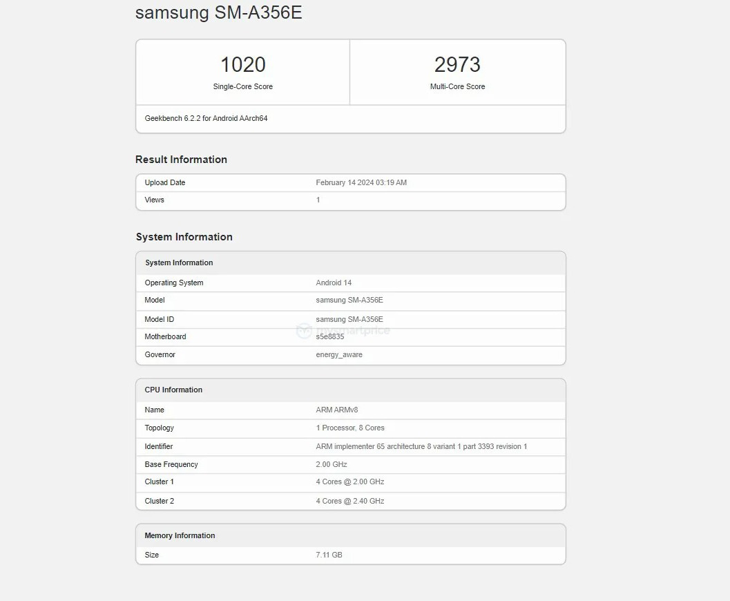 Samsung Galaxy A35 5G được liệt kê với số model A356E trên cơ sở dữ liệu Geekbench. Sự khác biệt duy nhất giữa kết quả mới và trước đó là danh sách trước đây đề cập đến RAM 8GB. Cùng số điểm cao hơn trong các bài kiểm tra lõi đơn và đa lõi, thiết bị đạt lần lượt là 1.020 và 2.973 điểm.