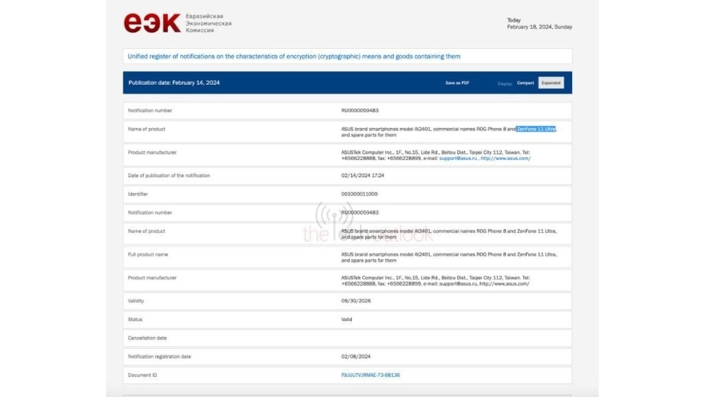 Theo dữ liệu EEC, ZenFone 11 Ultra được phát hiện mang số model AI2401 và có thể là phiên bản được đổi thương hiệu của ROG Phone 8. Mặc dù các chi tiết về thông số kỹ thuật của nó không được tiết lộ trong cơ sở dữ liệu này, nhưng trước đó danh sách GeekBench đã tiết lộ rằng nó được trang bị Snapdragon 8 Gen 3.