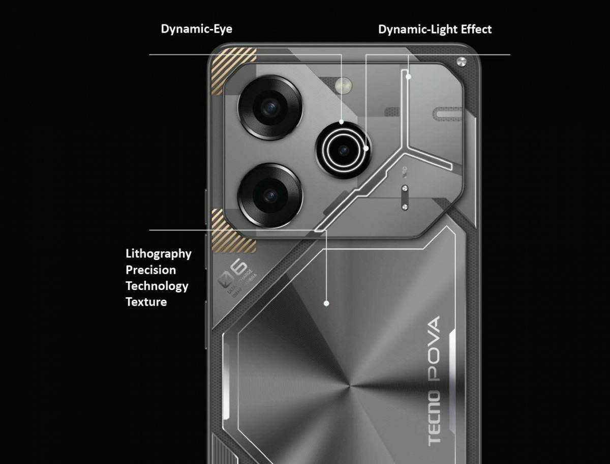 Pova 6 Pro là lần đầu tiên Tecno trang bị Dynamic-Eye, tương tự như Aura-Light của vivo, Dynamic-Eye bao quanh một trong ba ống kính và hiệu ứng Dynamic-Light, dải đèn LED hình cánh quạt. Có tổng cộng 210 đèn LED và 9 chế độ chiếu sáng với 101 hiệu ứng do người dùng thay đổi.