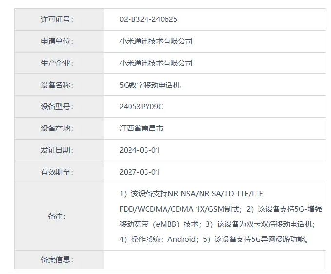 Chiếc smartphone mới của Xiaomi có mã số 24053PY09C đã hoàn tất đăng ký lên Bộ Công nghiệp và Công nghệ Thông tin Trung Quốc, tuy nhiên tên gọi chính thức chưa được công bố.