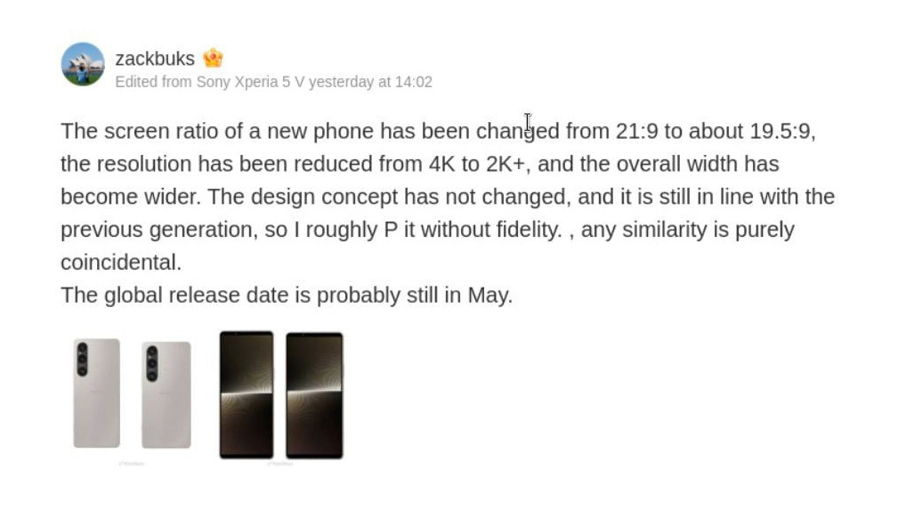 Theo bài đăng của leaker có tên Zackbuks trên Weibo, Sony Xperia 1 VI sẽ loại bỏ tỷ lệ khung hình 21:9 được ưa chuộng từ lâu để chuyển sang sử dụng tỷ lệ 19,5:9 thường thấy trên các smartphone khác như Samsung Galaxy S24 Ultra hay iPhone 15 Pro Max.