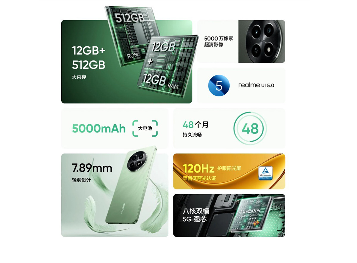 Về hiệu năng, nó được trang bị bộ xử lý MediaTek Dimensity 6100+ và kết hợp với RAM tối đa 24 GB (thiết lập 12GB RAM vật lý + 12GB RAM ảo) để hỗ trợ các tác vụ đa nhiệm cần nhiều sức mạnh. realme 12X chạy trên Realme UI 5.0, dựa trên hệ điều hành Android 14, cung cấp giao diện người dùng mới và phản hồi nhanh. Thời lượng pin ổn định với dung lượng 5000mAh và sạc nhanh 15W để tăng sức mạnh nhanh chóng.