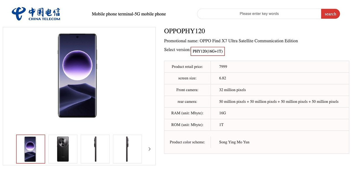 Điện thoại có số model PHY120 sẽ có dung lượng lưu trữ 1 TB, gấp đôi phiên bản cao nhất hiện nay trên thị trường Trung Quốc. Biến thể Find X7 Ultra mới sẽ có giá 7.999 CNY (quy đổi khoảng 24,4 triệu đồng), tăng 15% so với mức giá hiện tại cho tùy chọn 16/512 GB và không có kết nối vệ tinh.