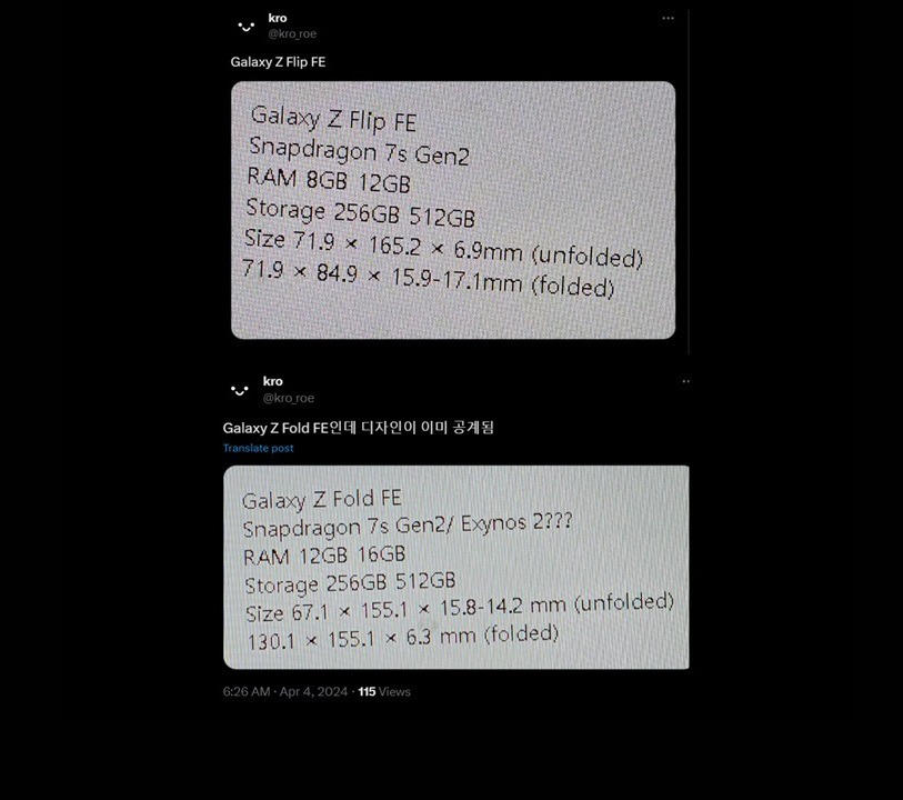 Trong một bài đăng trên X bởi tài khoản Kro nhưng hiện đã bị xóa, người này chia sẻ một số ảnh chụp màn hình thông tin cho rằng Samsung có thể đang phát triển các phiên bản giá cả phải chăng hơn cho các thiết bị có thể gập của mình dưới tên gọi dòng Fan Edition.